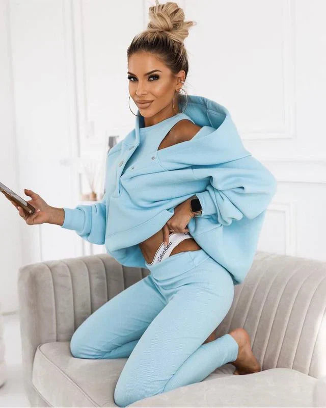 Découvrez notre ensemble trois pièces, alliant style et confort pour toutes vos activités Ce set comprend un sweat tendance, un débardeur chic et un pantalon slim qui mettront en valeur votre silhouette tout en vous offrant une liberté de mouvement inégalée.